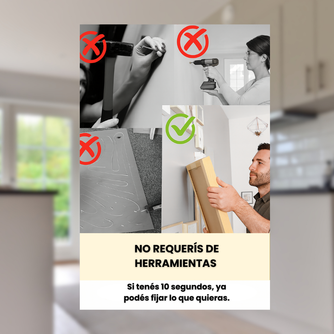 Ya probaste cintas que prometen mucho pero se despegan, dejan manchas o no resisten el peso. Y si alquilás, cada agujero en la pared puede transformarse en un dolor de cabeza (y de bolsillo).